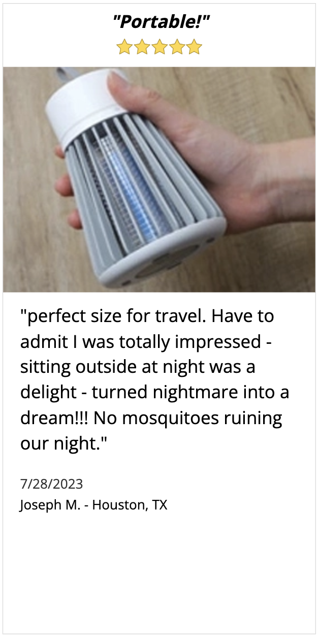 1. Works Instantly – BlitzyBug Zapper uses advanced UV technology to attract 5x more mosquitoes1. than any other device on the market. This proprietary tech is so effective, it can get rid of all the bugs within 600 square feet. That's half a mile all around! Enough to cover your porch, deck, bedroom, garden, backyard, and campsite.