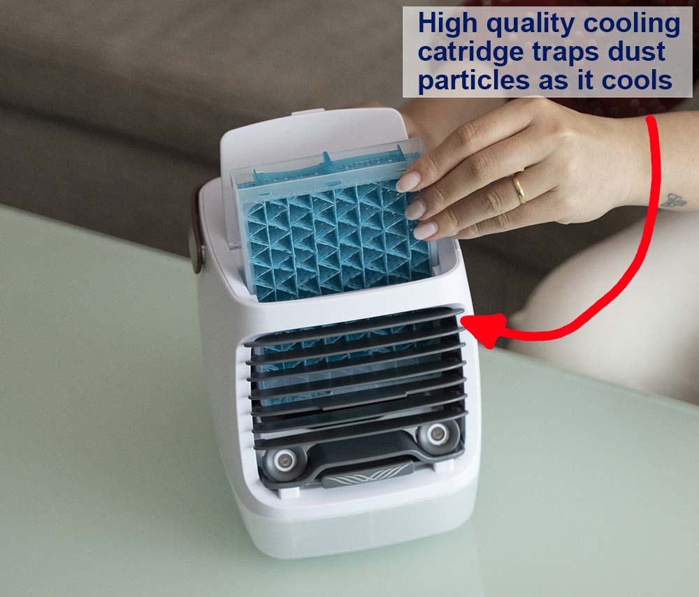 The ChillWell 2.0 Portable Air Chiller has a Cooling Cartidge that can help trap all these particles before they get blown on you.