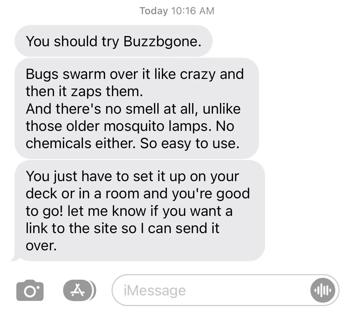 Later that night, I messaged my friend and told him that his recommendation was a hit, and he was excited about it, too. Turns out he knows one of the creators, and this guy told him that BuzzBGone was doing so great, they were selling out almost as soon as they stocked up! So if you're reading this blog and want to try BuzzBGone yourself, I suggest grabbing one now. With more people spending time outdoors, I'm sure they'll be sold out again soon.